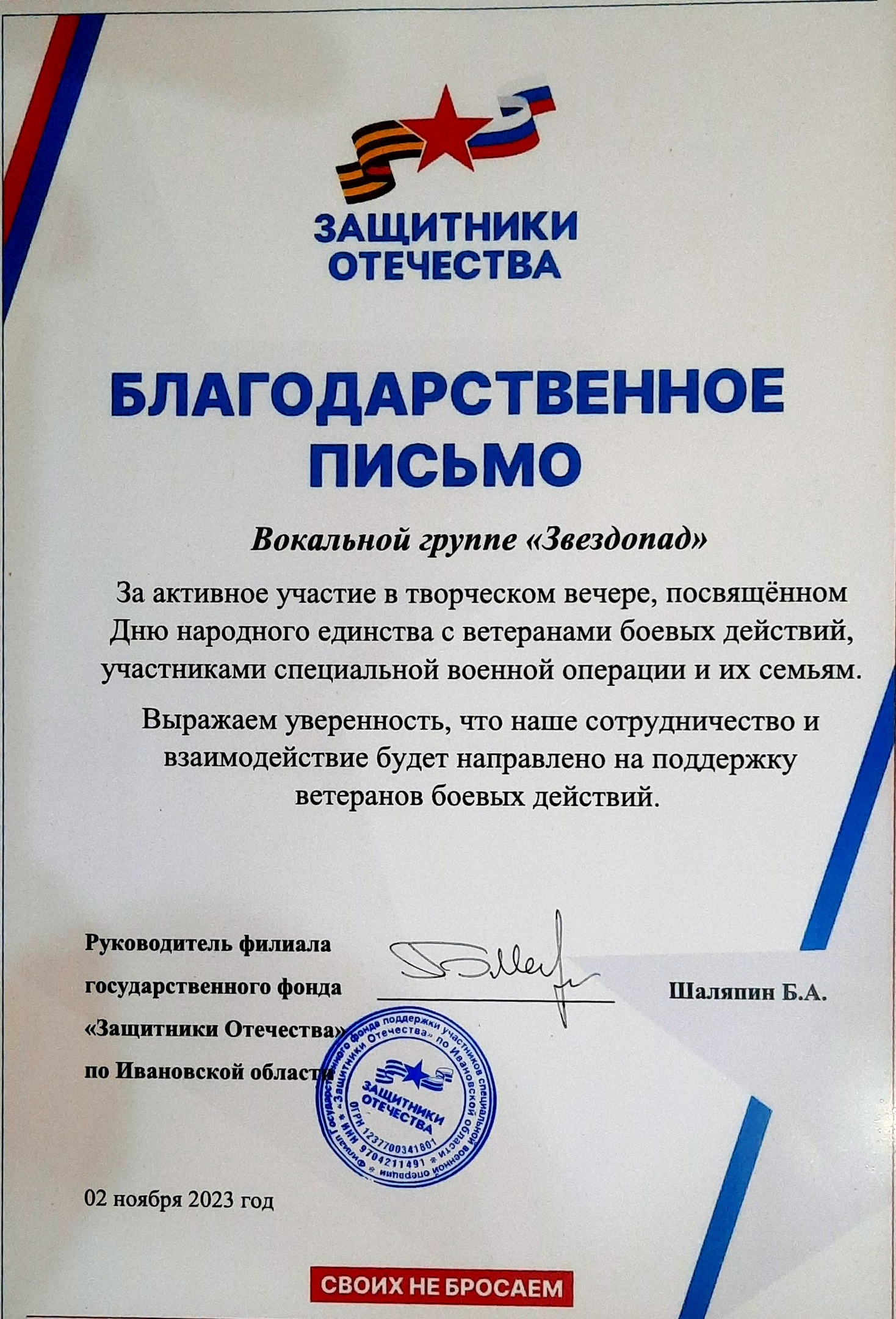 2 ноября в государственном фонде «Защитники Отечества по Ивановской области» Заслуженный коллектив Ивановской области вокальная группа «Звездопад» под руководством Булгакова Алексея Владиславовича приняли участие в творческом встрече посвящённом Дню народного единства с ветеранами боевых действий, участниками специально военной операции и их семьям.