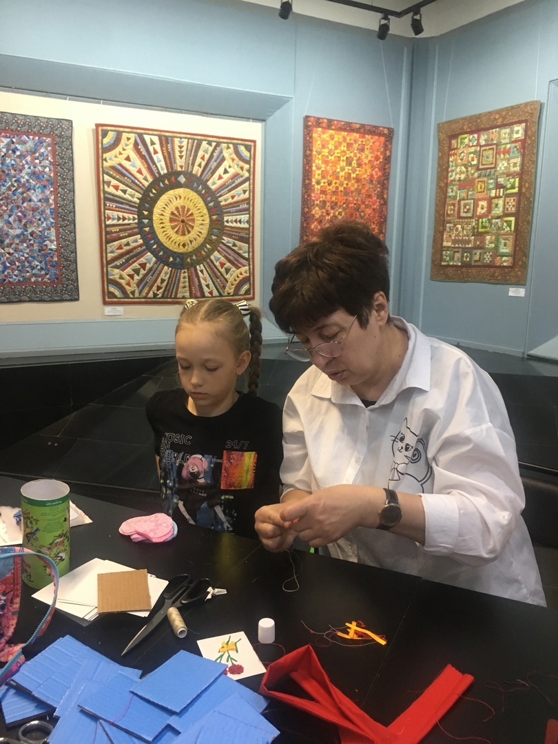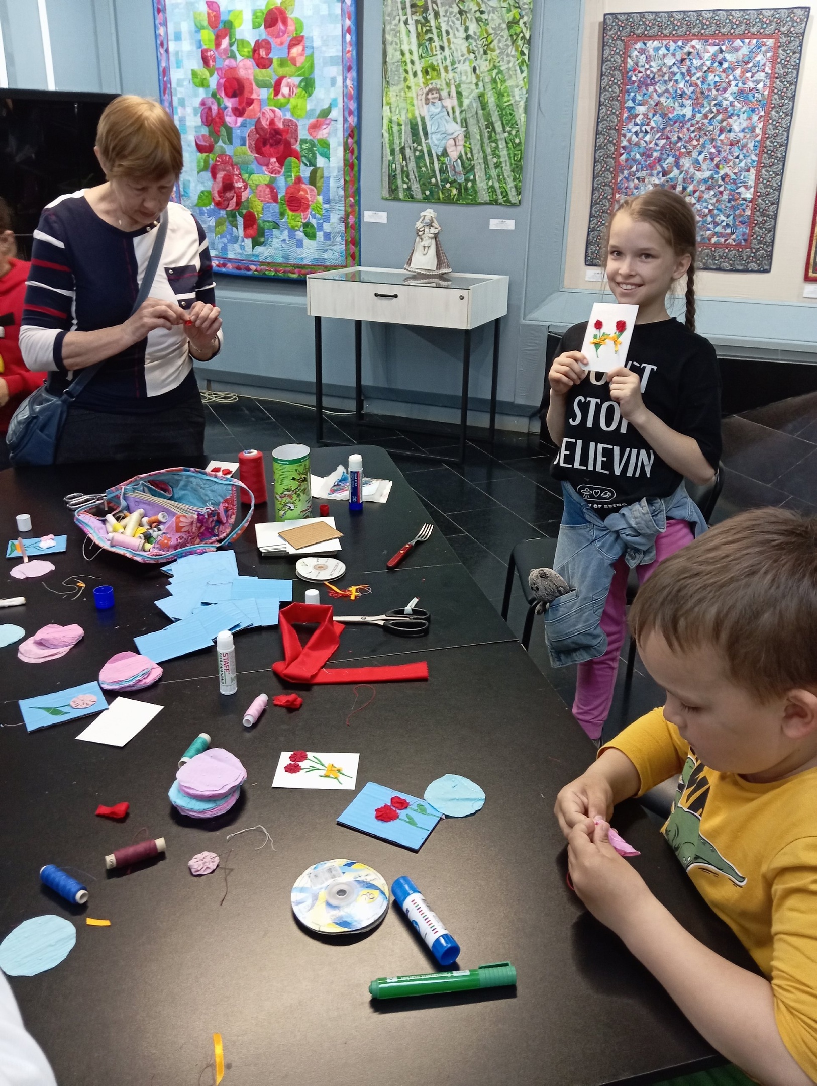 18 мая в Международный день музеев руководитель народного коллектива «Лоскутная мозаика» Марина Тулупова провела мастер-класс по созданию открытки для юных посетителей Ночи музеев в Шуйском историко-художественном и мемориальном музее имени М.В. Фрунзе, где сейчас проходит выставка коллективных работ клуба. Ребята научились мастерить миниатюрные гвоздики и незабудки из ткани и декорировать ими открытку.