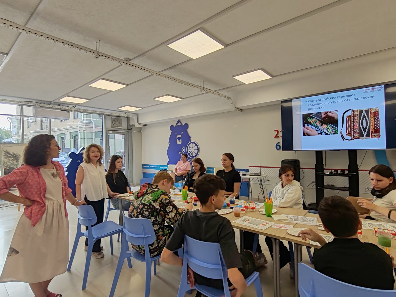 Заведующая отделом ИЗО и ДПИ Областного центра культуры и творчества Анастасия Шоличева дала ребятам небольшую вводную на тему традиционных ремёсел и промыслов Ивановской области, их отличиях и предпосылках зарождения. Затем ведущие мастер-класса художник-дизайнер Елена Антонова (г. Шуя) и педагог Молодёжного информационного центра г. Шуи Ирина Филиппова предложили ребятам попробовать себя в качестве рисовальщиков предприятия народных художественных промыслов «Шуйская гармонь» и украсить корпус гармони палехской росписью. Также ребятам было позволено отойти от традиции и пустить в ход фантазию. В итоге получились интересные рисунки, выражающие темперамент и настроение авторов.