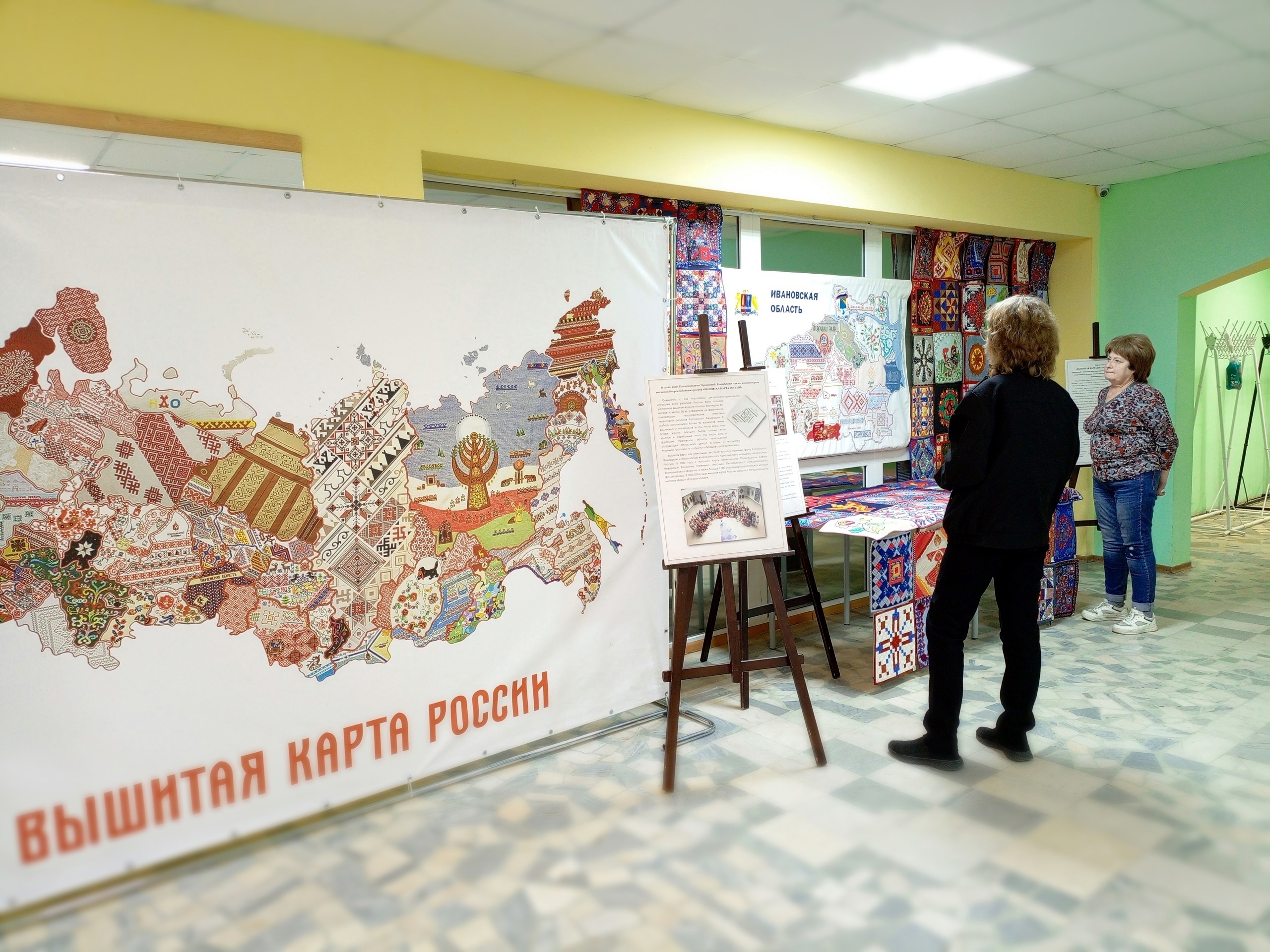 Напомним, на выставке экспонируется вышитая карта Ивановской области, созданная в рамках всероссийской акции «Вышитая Россия» в 2023 году. Карту вышивали 36 мастериц из 21 муниципалитета области. На фрагменте, соответствующем очертаниям городского округа Кохма, изображён цветок льна. Его выполнили Оксана Витальевна Цветкова и Людмила Саляевна Жохова