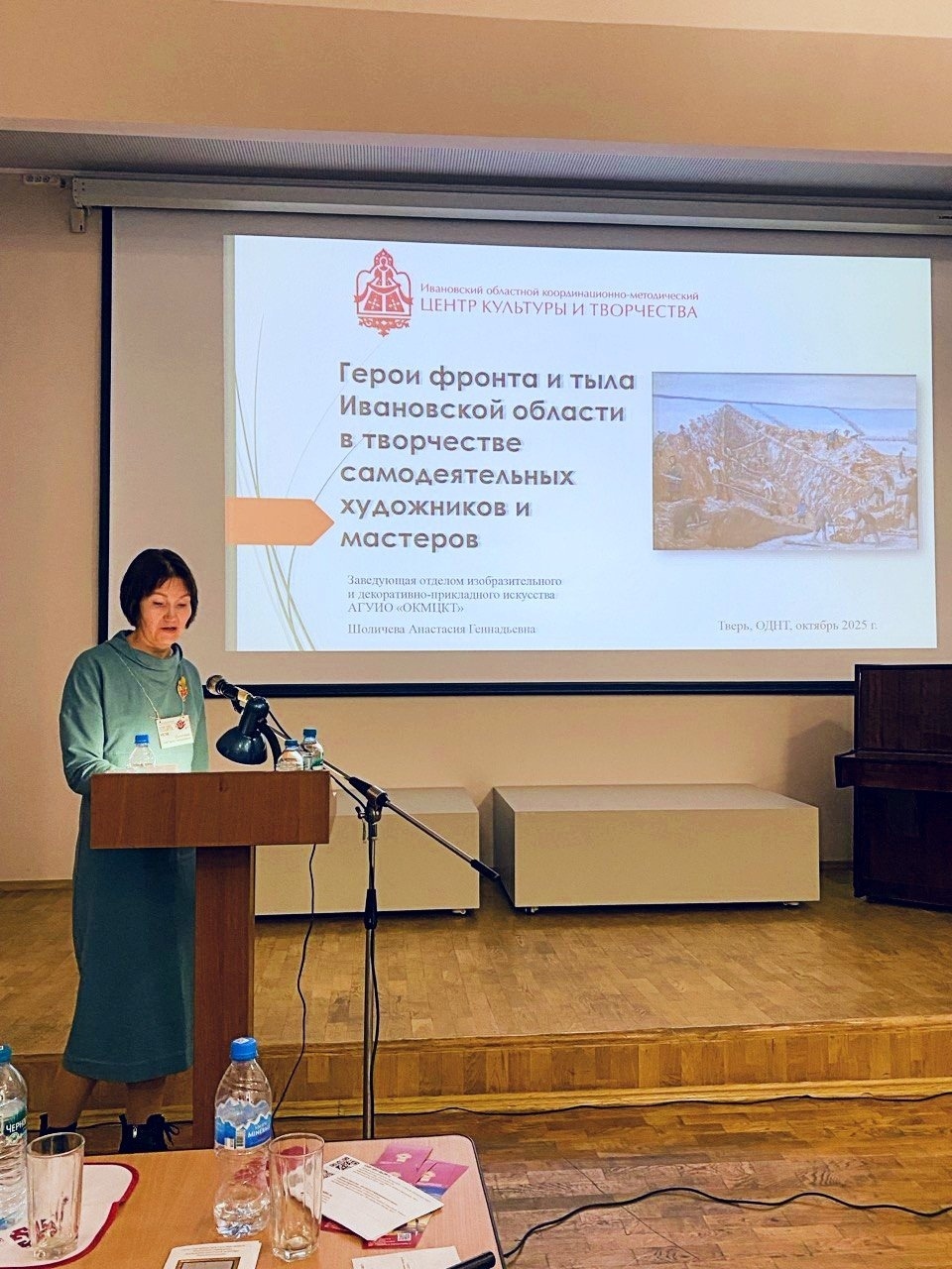 Заведующая отделом ИЗО и ДПИ Областного центра культуры и творчества Анастасия Шоличева выступила с докладом о героях фронта и тыла Ивановской области в творчестве самодеятельных художников и мастеров.