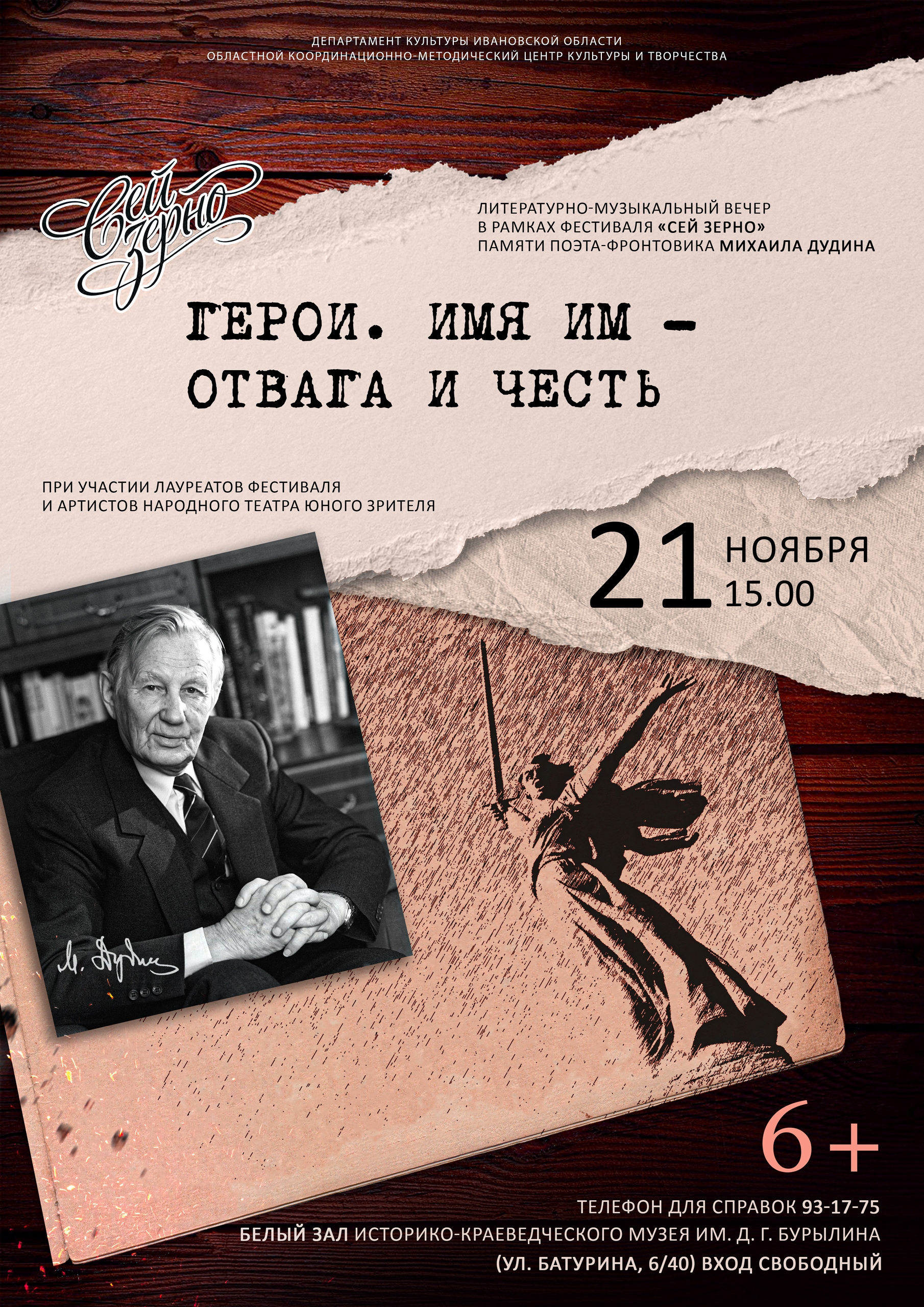В Белом зале Ивановского государственного историко-краеведческого музея имени Дмитрия Бурылина прошел творческий вечер «Эхо фестиваля «Сей зерно», который назывался «Герои — имя им отвага и честь». Мероприятие уже в третий раз проводит Областной координационно-методический центр культуры и творчества. Оно приурочено ко дню рождения советского прозаика, поэта, переводчика и журналиста, военного корреспондента, уроженца фурмановской земли Михаила Александровича Дудина.