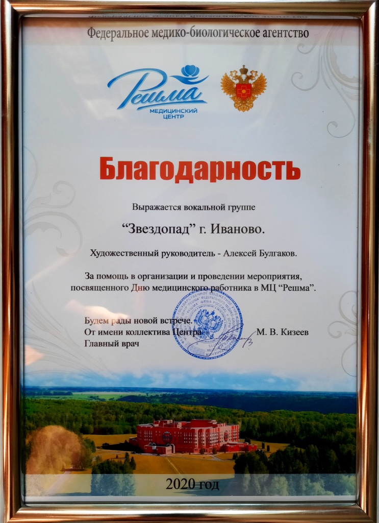 19 июня 2020 г. вокальная группа "Звездопад" (руководитель - Алексей Булгаков) поздравила врачей, медсестер, весь персонал медицинского центра "Решма" с наступающим Днем медицинского работника.