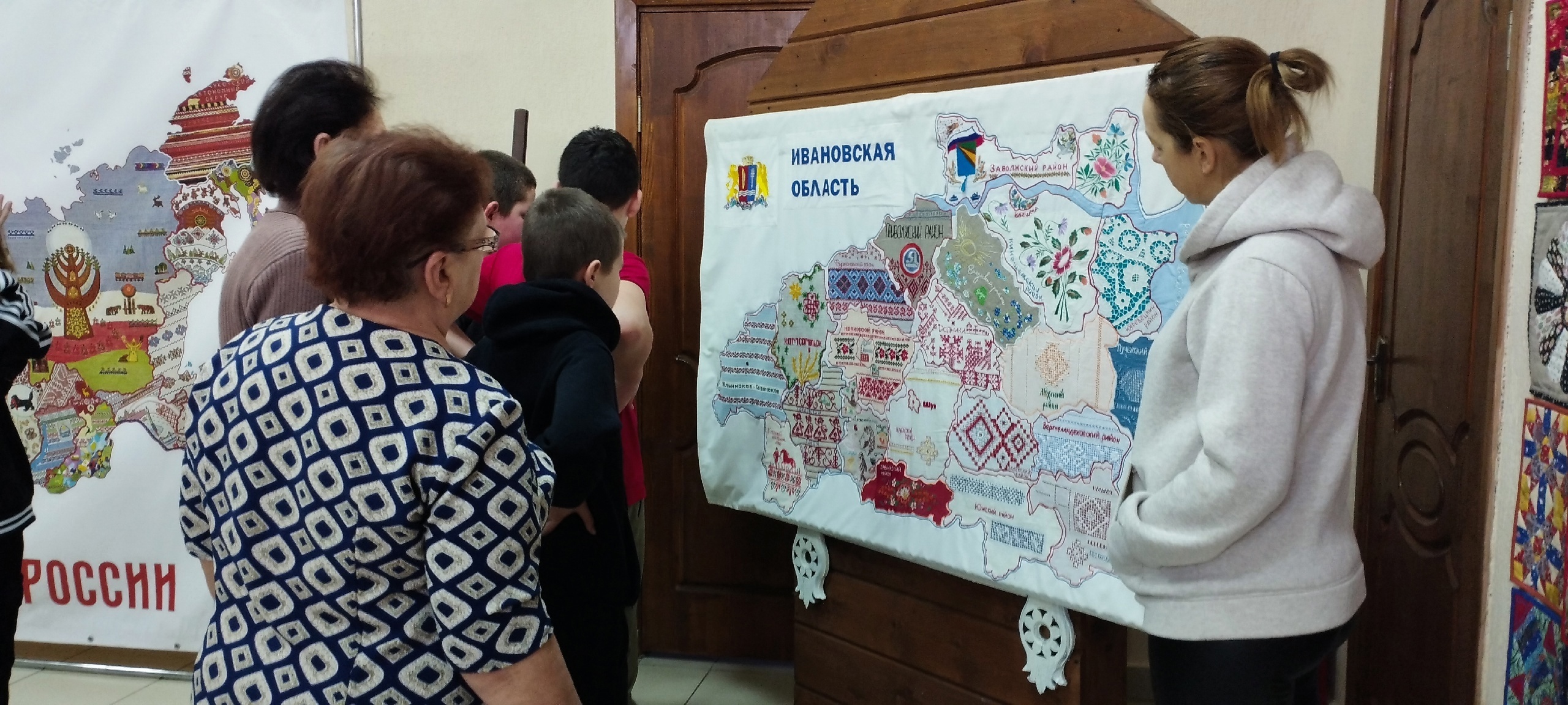 Напомним, на выставке экспонируется вышитая карта Ивановской области, созданная в рамках всероссийской акции «Вышитая Россия» в 2023 году. Карту вышивали 36 мастериц из 21 муниципалитета области. На фрагменте Тейковского района вышит орнамент, традиционный для границы Нижегородской области и Чувашии, так как в советское время в Тейковский район на торфоразработки приезжало много людей из Нижегородской области, Чувашии, Мордовии, и они оставили здесь своё культурное наследие. Работу выполнила жительница посёлка Новое Леушино Елена Саратовская.