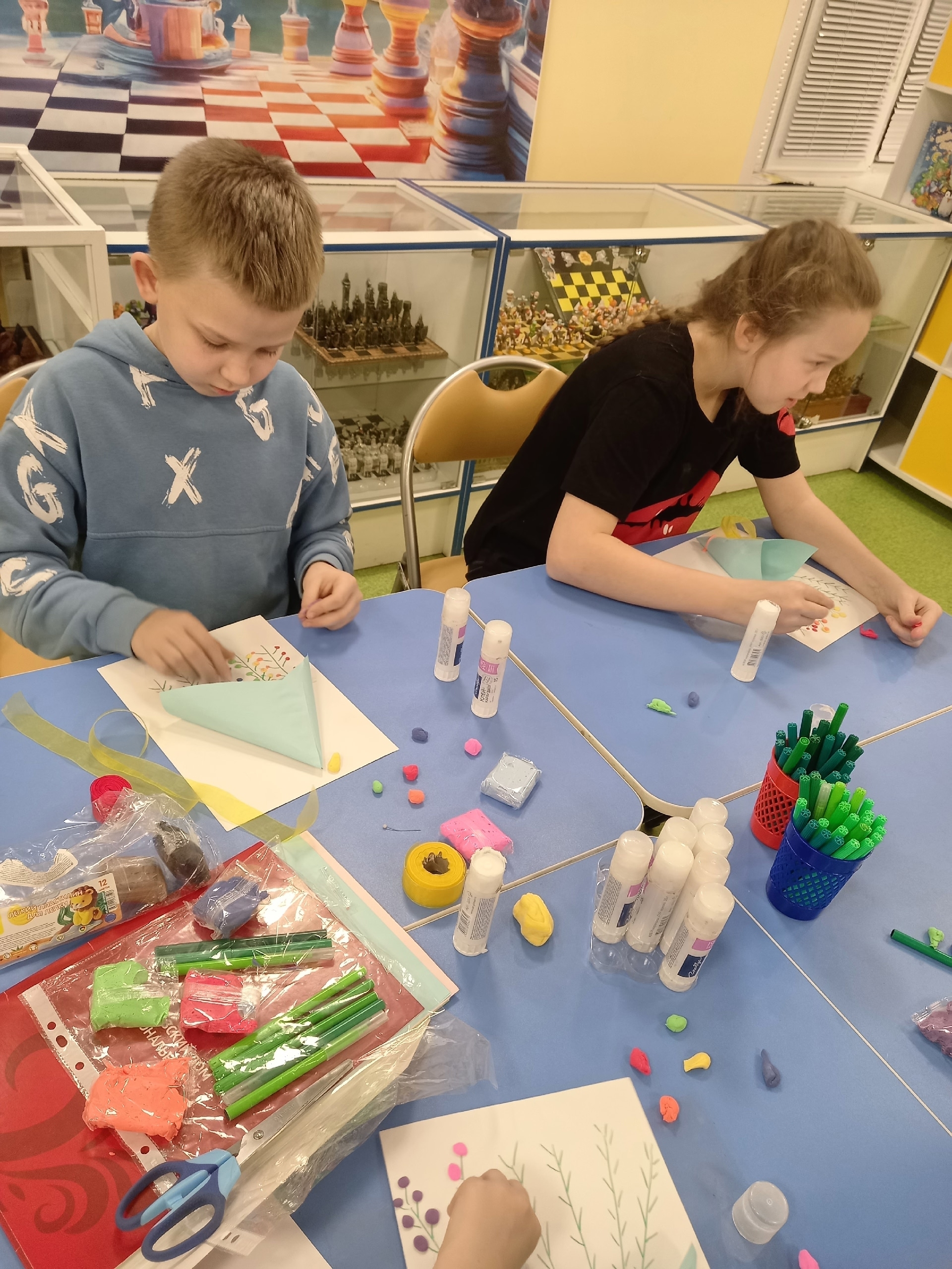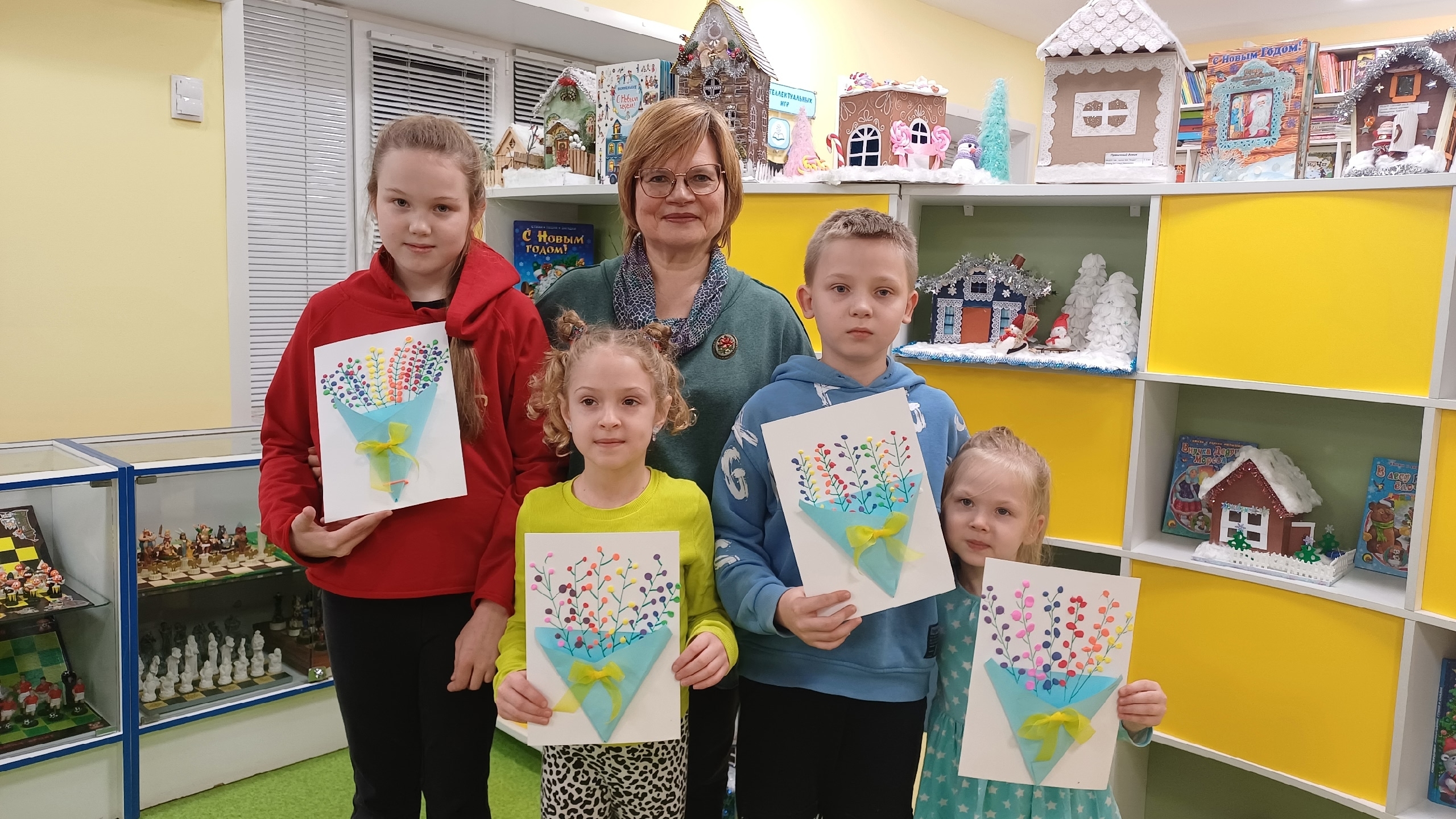 Занятие состоялось в рамках работы детского клуба «Левша». Дети создали оригинальные открытки с букетами в смешанной технике.