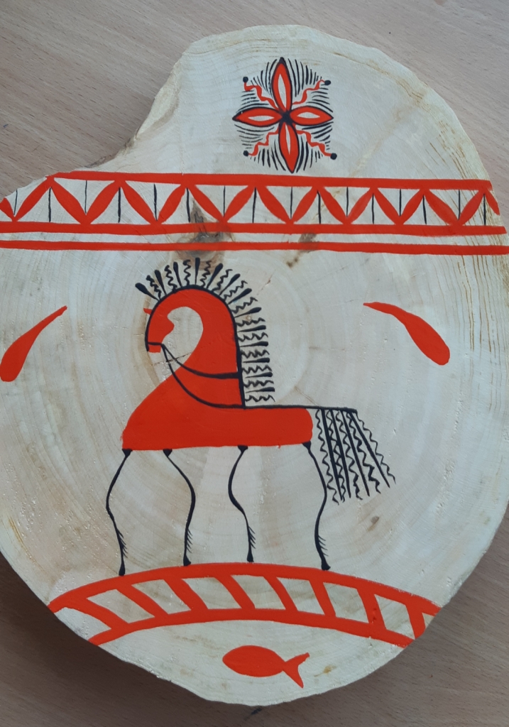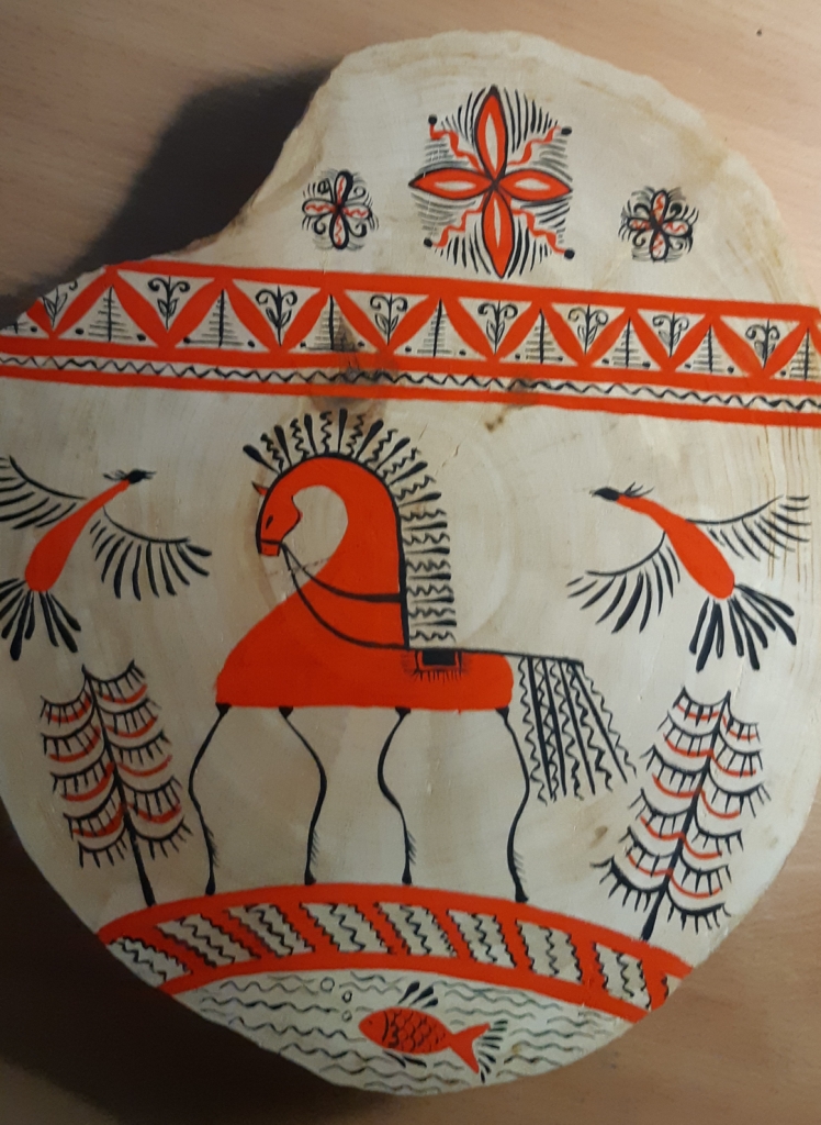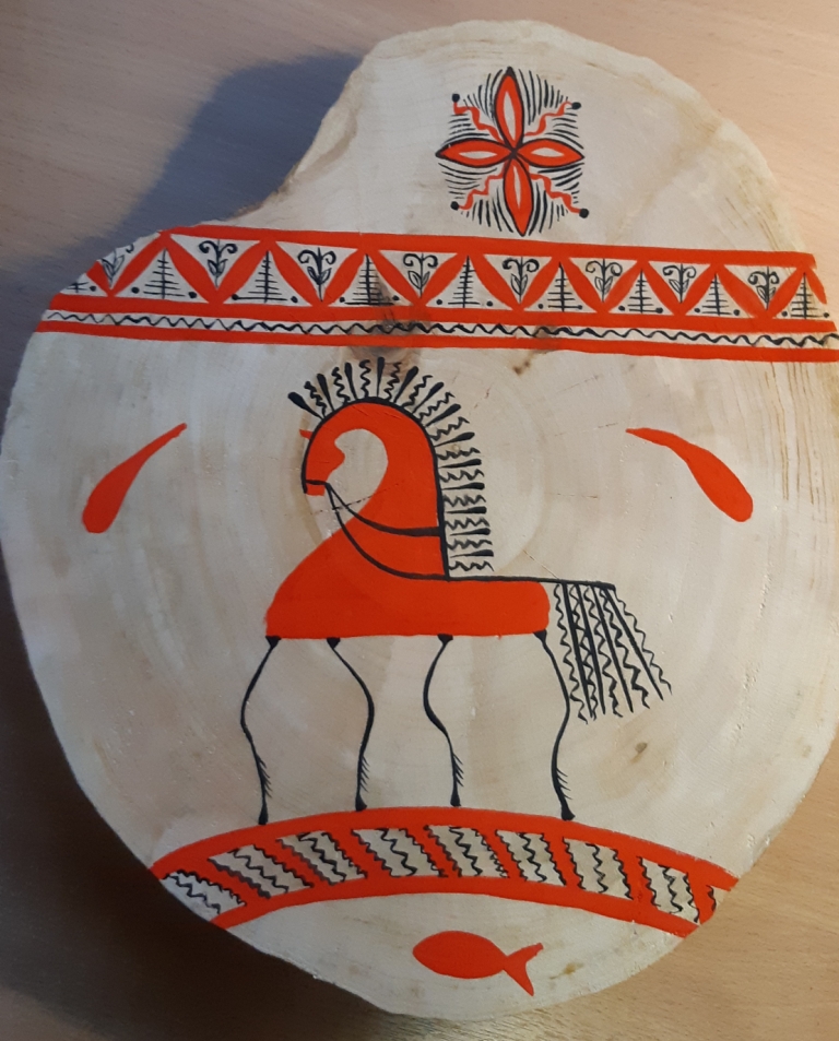 Кроме них, родных, очень люблю мезенскую. Этот тип народной росписи зародился в низовьях реки Мезень и использовался для украшения домашней утвари. Элементы её похожи на наскальные изображения, встречающиеся в этих местах, в ней явно прослеживаются архаичные корни. Немногоцветная, условная, она несёт в себе отпечаток суровых реалий края. В мезенской росписи меня завораживает то, как неожиданно в этой чёткой орнаментальности и немногоцветии передаётся динамика: стремительный бег коней, полёт птиц, движение стихий. Поистине волшебно…"