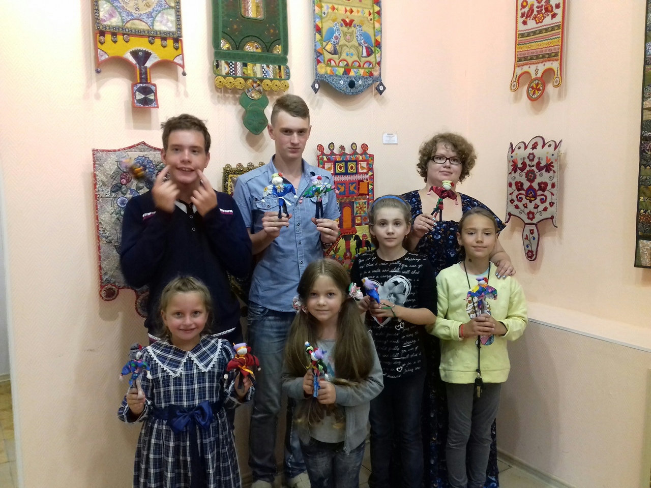 Ведущий методист по декоративно-прикладному искусству Анастасия Шоличева провела для гостей экскурсию по выставке и мастер-класс по созданию традиционной тряпичной куклы Кулачника. Посетители с интересом рассматривали репродукции известных лубочных картинок "Кот казанский", "Удалые молодцы, добрые борцы", "Медведь с козой прохлаждается". Затем все вместе отгадывали загадки, вышитые на панно "По горам, по долам", смеялись над работой "Частушки", узнавали любимых героев русских сказок на панно "Сказки", внимательно разглядывали обмундирование и форму солдат с панно "Лейб-гвардия".