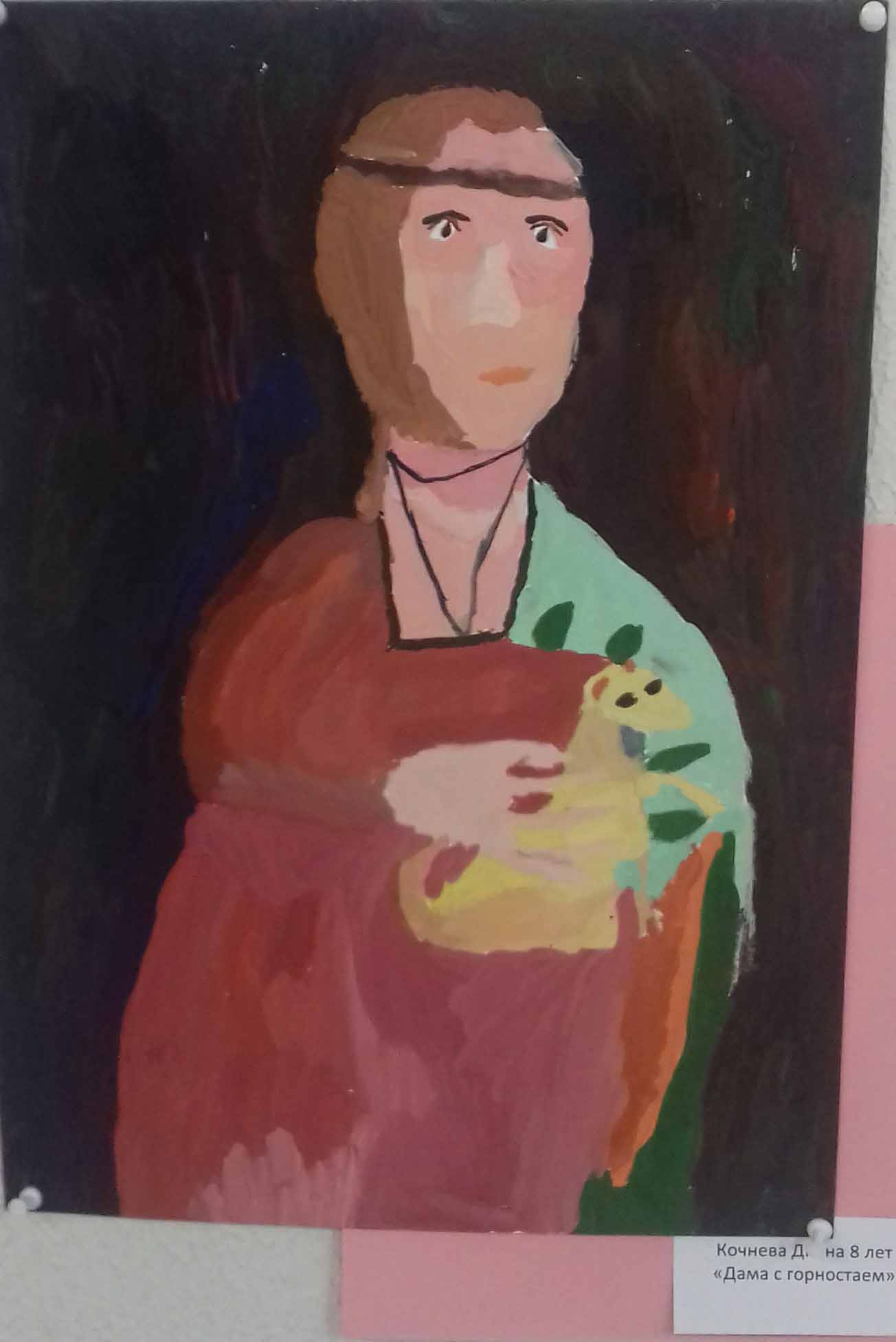Выставка в Родниковском турцентре интересна ещё и тем, что здесь, наравне с профессиональными копиями С.Н. Михальченко, представлены рисунки детей из родниковской ИЗО-студии. Это тоже попытки копировать известные картины Васнецова, Шишкина, Кустодиева, да Винчи, Вермеера и других великих художников. Рисунки чисты, наивны и вызывают у зрителя самые позитивные эмоции.