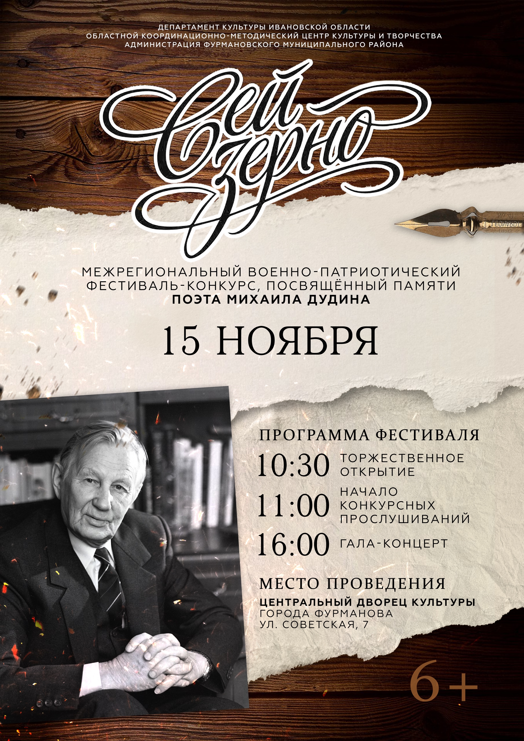 15 ноября 2025 года на Фурмановской земле вновь состоится межрегиональный военно-патриотический фестиваль-конкурс «Сей зерно!», посвященный памяти поэта Михаила Александровича Дудина.
