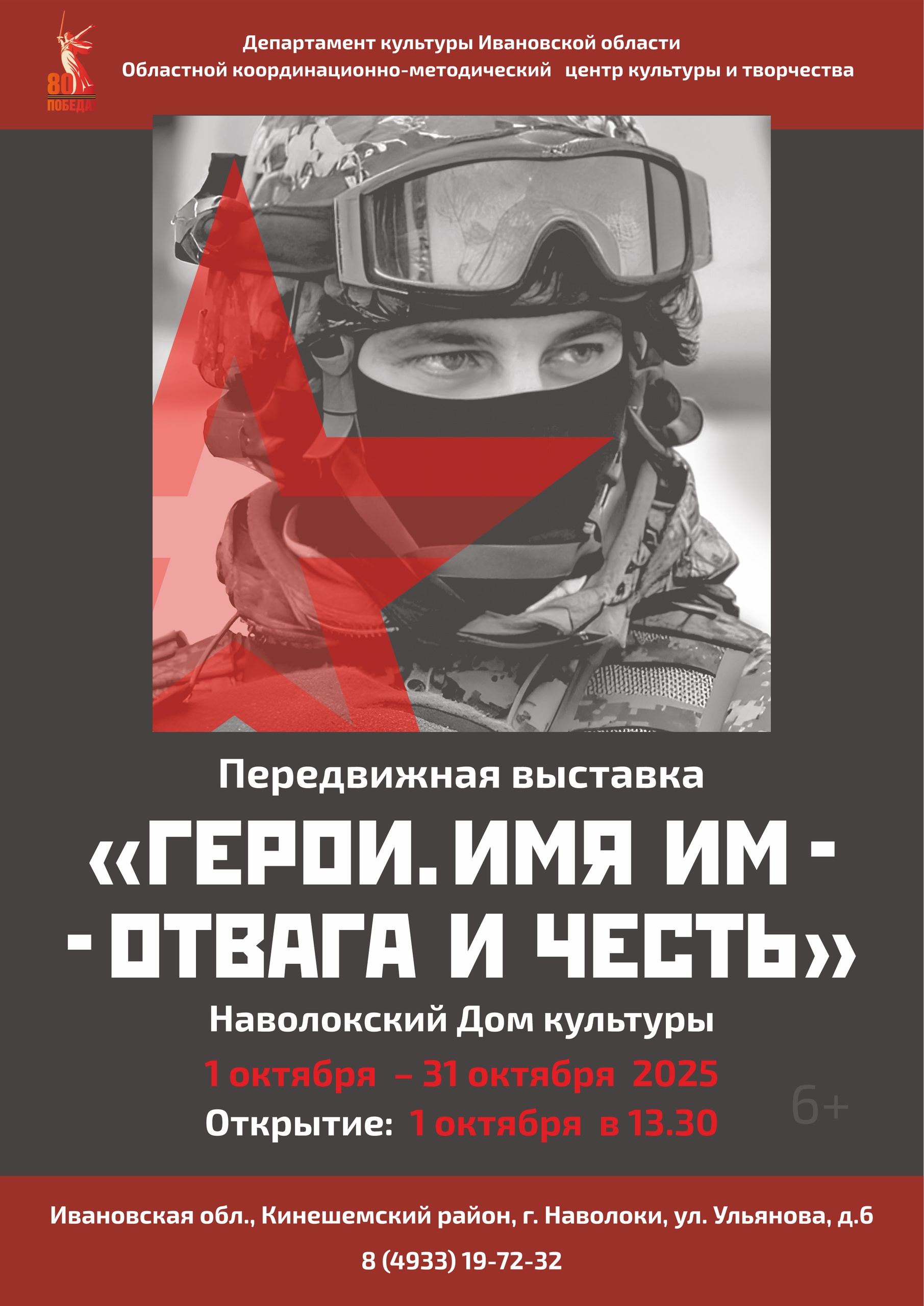 1 октября 2025 г. в Наволокском Доме культуры Кинешемского района состоится открытие областной передвижной выставки «Герои. Имя им – отвага и честь». Организатор - Областной центр культуры и творчества при поддержке Департамента культуры Ивановской области.